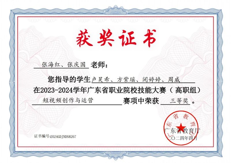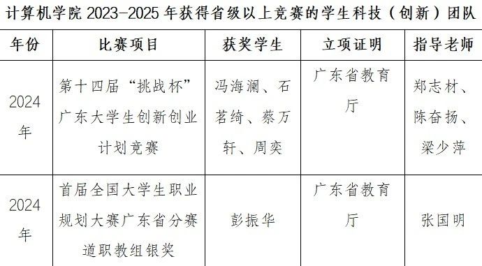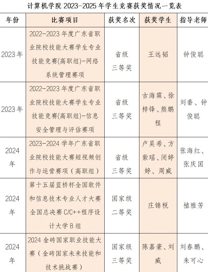 竞赛成绩:近五年获蓝桥杯全国大学生软件设计大赛中多次获得一等奖、二等奖,全国职业规划大赛获得广东省赛银奖,全国互联网+创新创业大赛获得银奖铜奖等,学生技术能力获行业权威赛事认证。