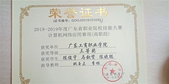 陈俊宇,陈晓聪,马钦贤,计算机网络应用专业,2018年全国职业院校技能大赛-计算机网络应用赛项三等奖,“华南智慧城杯”2019粤港澳大湾区IT应用系统开发大赛(肇庆赛区)团队奖。