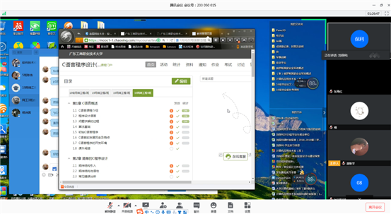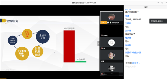 各教研室主任汇报了本教研室网络上课情况,提出一些需要解决的具体问题。优秀教师代表张海红、刘保利、刘顺裕和钟俊聪通过屏幕共享的方式为大家展示他们的课前准备、上课模式和课后沟通。各位老师们针对网络教学存在的一些问题,共同探讨,想办法,出主意。