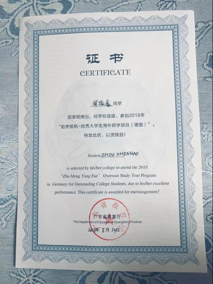 “助梦扬帆”——计算机系周振豪同学赴德国参加省教育厅海外研学项目