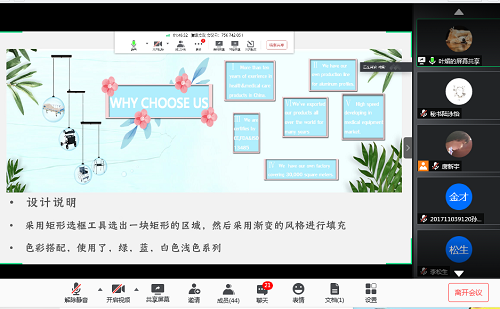 会议中,每个学生轮流展示自己的论文或者毕业设计,一个个优秀的毕业设计展示出学生的认真和指导老师的细致。每位学生展示完毕,都会有指导时间,答辩小组的老师针对学生的论文或设计肯定其优秀之处,同时指出可以修改的地方,鼓励学生继续完善,力争做成优秀的毕业设计。