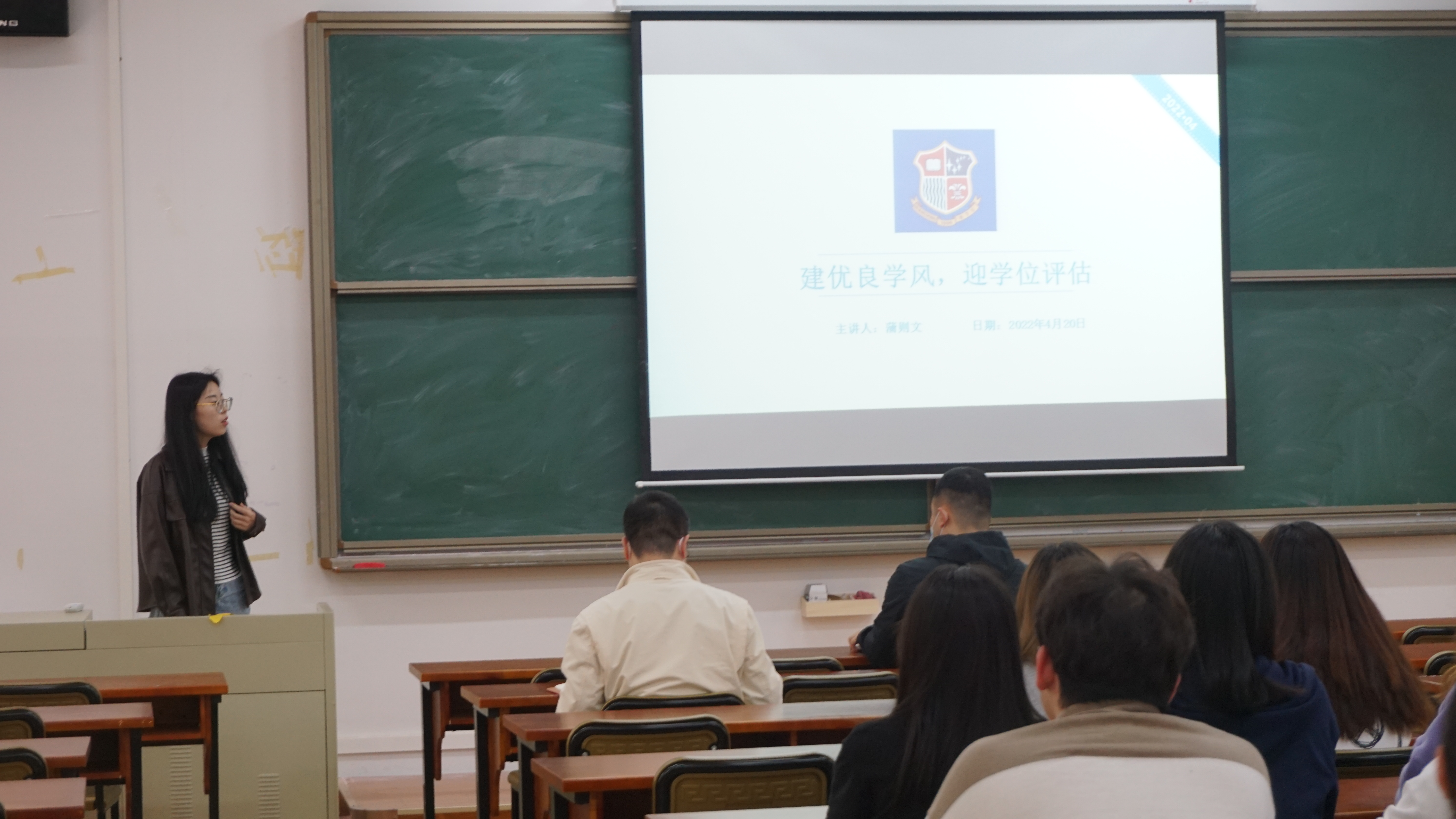 蒲则文进行学士学位评估知识普及,从学校、学院及师生角度讲解学士学位评估的意义,引领同学们从自身做起,规范言行举止。蒲则文还带领大家认真学习《学士学位授权评审工作手册》,着重讲解我校校训、校风、学风、教风,本科教学工作合格评估的核心内涵等知识。