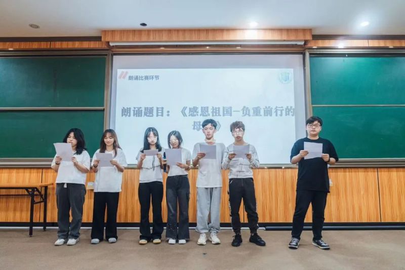 团体朗诵中,杨金宏、董明桃、盛银淇、苏佳宜、张桦基、丘森文、肖杰同学则用《感恩祖国——负重前行的母亲》将家国情怀融入诗行,讴歌祖国母亲在时代浪潮中坚韧与担当。