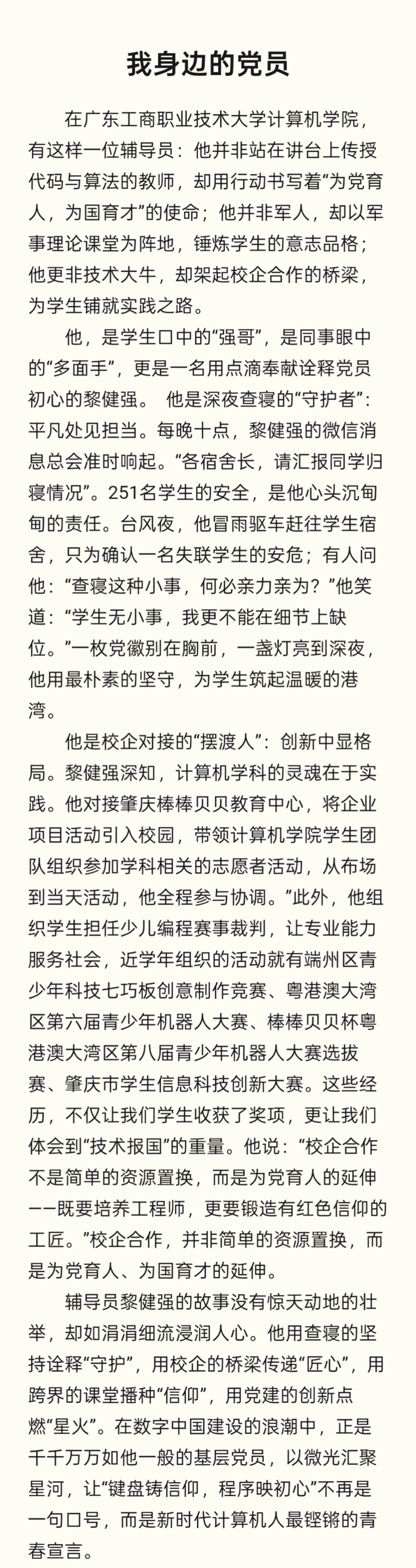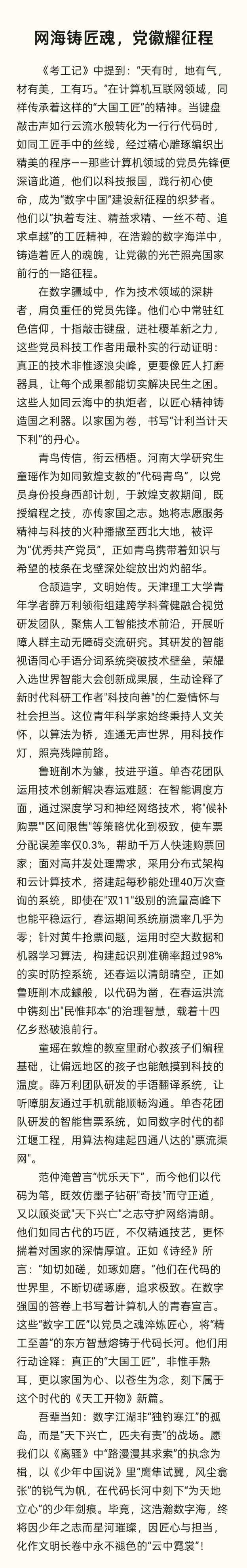 2025年4月16日至4月26日,永利集团3044欢迎你特开展主题为“赤曜领航,计引未来”的征文大赛。本次比赛不仅为同学们提供了一个展示自我、交流思想的平台,更是一次深刻的思想启迪与精神洗礼。从对 “新文化运动” 的深入思考,到对计算机领域 “大国工匠” 精神的精彩演绎,再到对身边党员故事的细腻描绘,参赛作品生动展现了新时代青年对科技报国的深刻理解和坚定信念,彰显了计算机领域青年学子将技术创新与党性信仰深度融合的决心和担当。