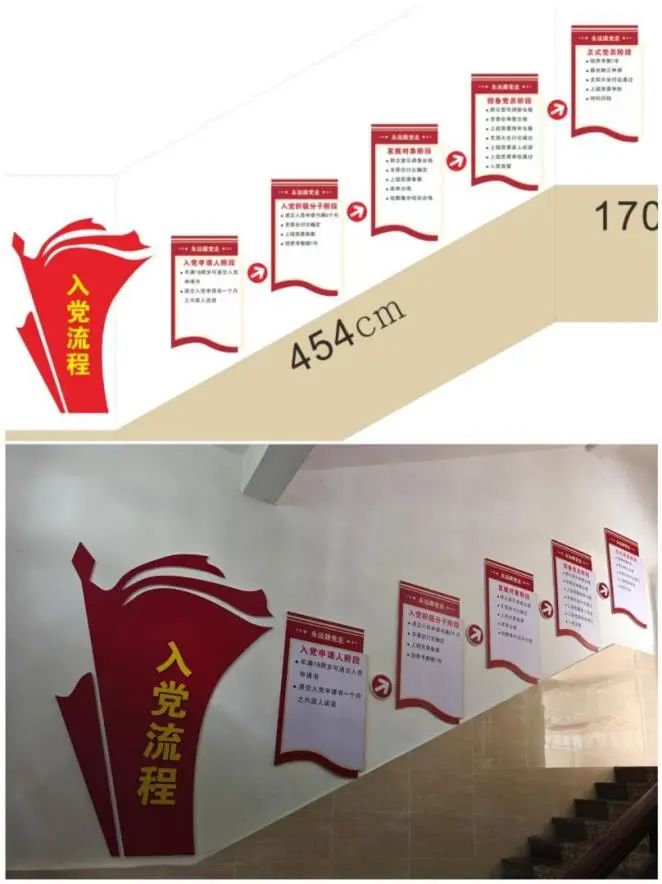 从明辨楼西北侧一楼夹层延伸至二楼墙面,张贴了党员发展流程指引。该展示区对各阶段的培养考察要求、流程规范及关键节点进行了说明,为党员发展工作提供了标准化的指引,也让师生对入党流程有了更系统、直观的认识,有助于吸引更多优秀师生向党组织靠拢。